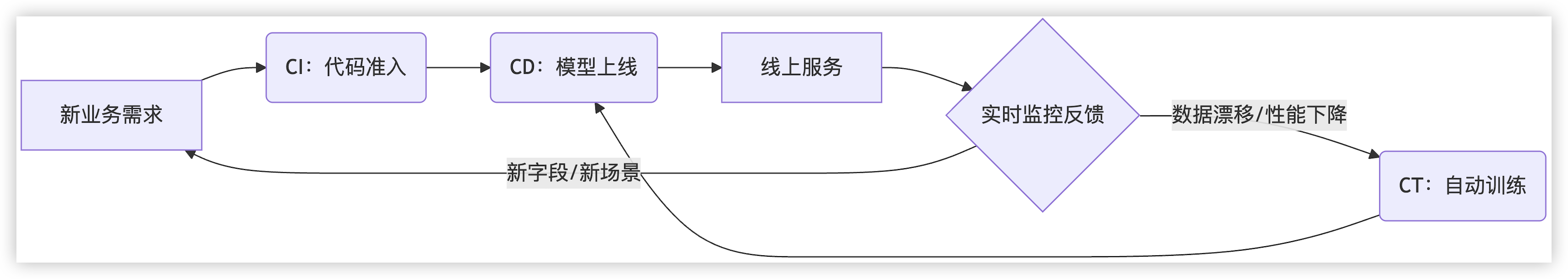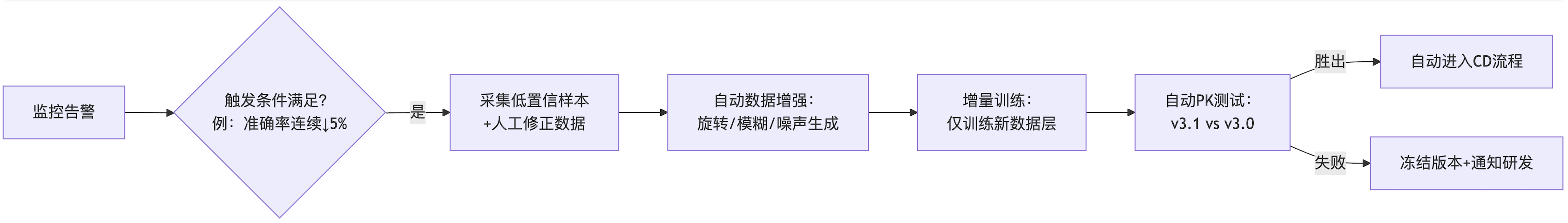 - 标:发现模型性能下降或样式新增时,自动 retrain + 上线