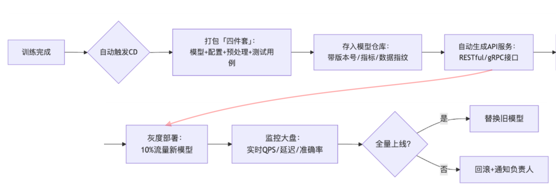 ② CD 的流程(以容器部署为例)步骤 动作 举例 构建镜像 把模型、服务代码、依赖打包 Docker build -t ocr-service:v1 . 单元测试 用样例输入测试推理接口 调用 /predict接口,验证输出正确发布服务 将容器部署到线上环境 push 到 K8s、SageMaker、阿里PAI等 配置路由 设置网关/API 接入地址 配置 Nginx 或 API 网关映射 健康检查 启动后探测服务状态 readiness/liveness probes,返回 200 OK 通知上线 发布日志、钉钉通知、版本变更说明 通知运维、业务方